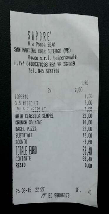 Il conto: 2 pizze, una bottiglia d’acqua naturale, una bottiglia di “Quinto Quarto Bianco” 2015 Franco Terpin = 86 €