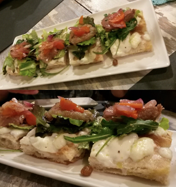 IMG_8217Il benvenuto dello chef è un crostino di pane a Pasta Madre Viva con crema di formaggio caprino, funghi, misticanza e semi di papavero ma la degustazione vera e propria si apre con Pane Semi&Salumi, bocconcini di pane ai semi serviti con lardo aromatizzato con scannello, con crema di ricotta e zucchina cruda a julienne aromatizzata alla menta e con Stortina Veronese e Monte Veronese di malga. Perfetti per stuzzicare l’appetito e davvero un’ottima idea… chi mai penserebbe di ordinare del pane in pizzeria?