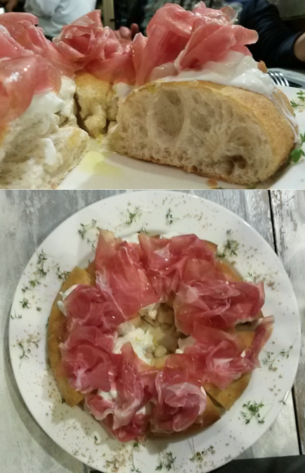 E’ il momento della fragrante Pizza in pala, a lievitazione mista, servita su un tagliere e divisa in due farciture: mezza margherita con olive taggiasche e pomodorini e mezza con mozzarella di bufala, pancetta e monte veronese. Sono le ultime pizze che assaggiamo, ma non ne avremo mai abbastanza!